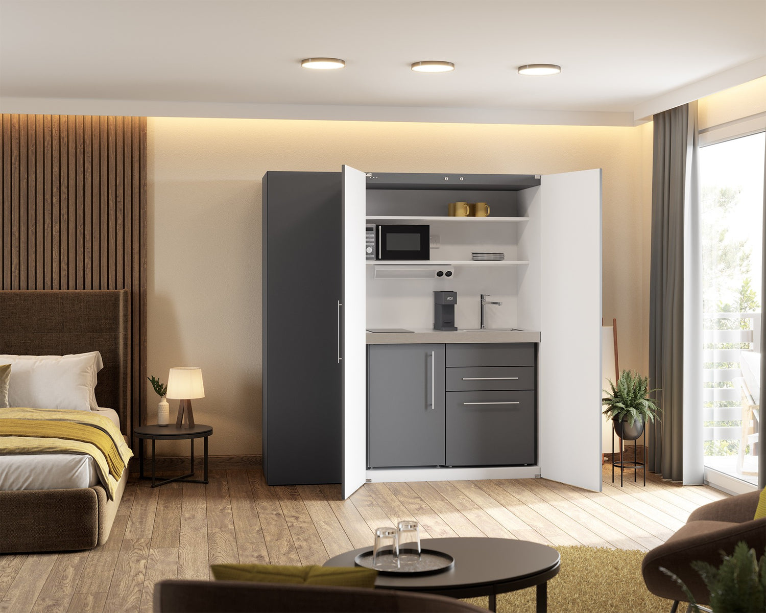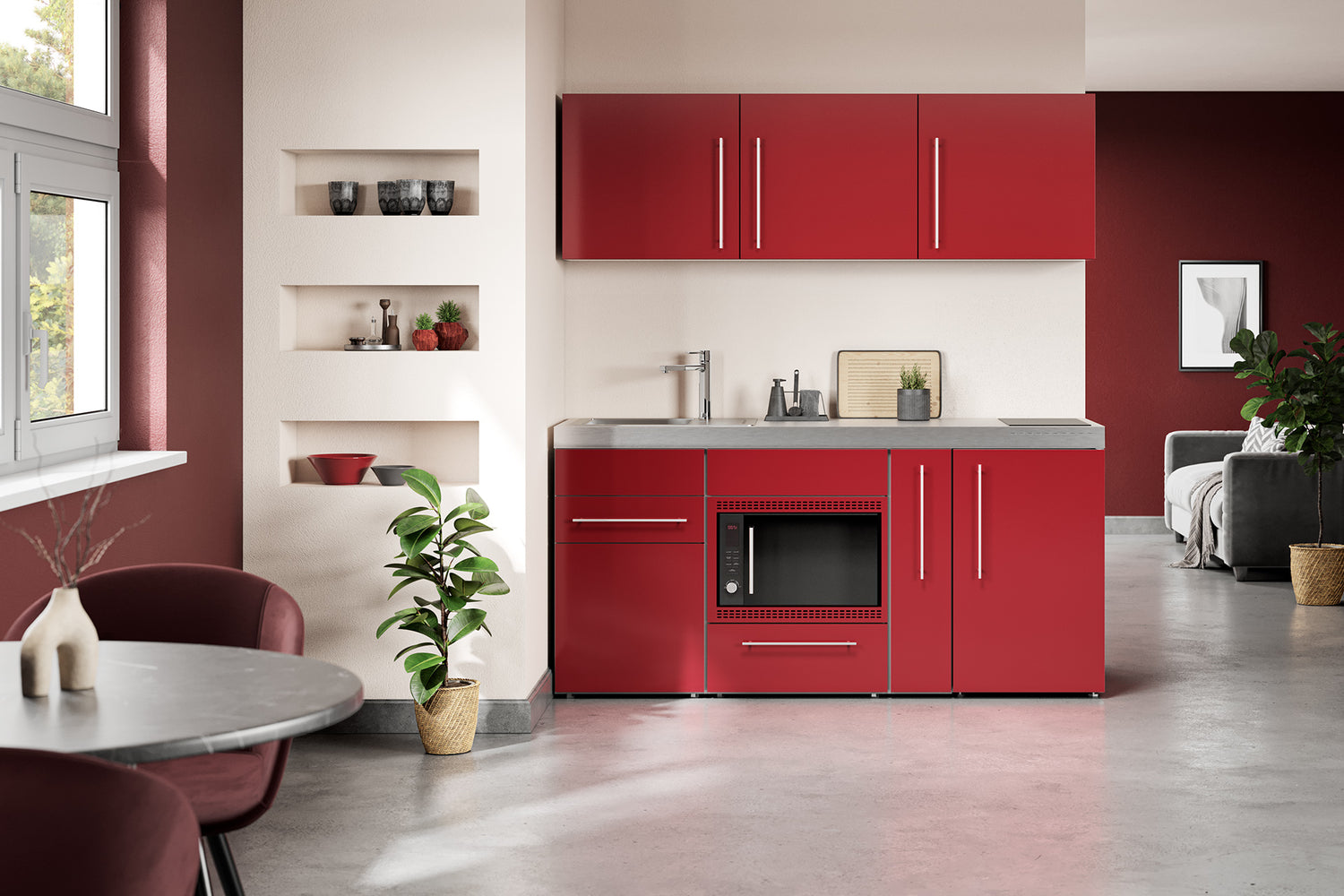 Consultando il nostro catalogo potrete scegliere la vostra mini cucina definendo colori e finiture, elettrodomestici e piani cottura. Creerete così la soluzione più adatta alle vostre esigenze di spazio e al vostro gusto personale.