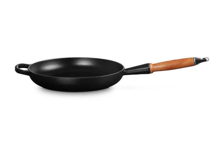 - Padella in ghisa vetrificata con manico in legno compatibile con tutte le fonti di calore come vetroceramica, induzione, gas. Il manico in legno non va in forno